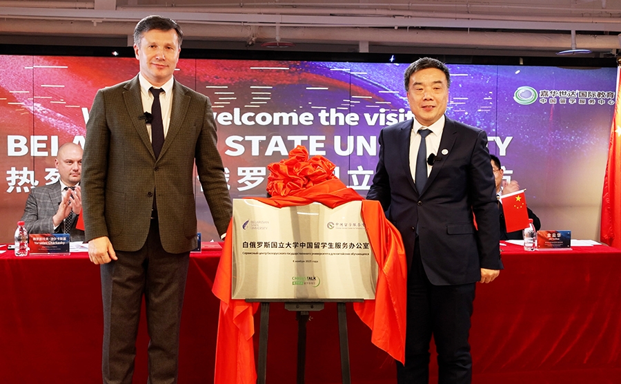 在双方领导和嘉宾的见证下,王大泉书记与安德烈·德米特里耶维奇校长共同签署了战略合作协议。随后,“白俄罗斯国立大学中国留学生服务办公室”正式揭牌。该办公室将围绕中国学生赴白俄罗斯留学的实际需求,提供涵盖院校对接、政策解读、学业辅导与生活支持等一站式服务,为学子顺利完成留学之旅保驾护航。