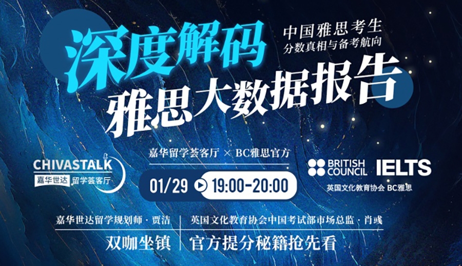 1月29日晚,嘉华留学“荟客厅”与英国文化教育协会(BC)雅思官方联合推出的专题直播《雅思大数据报告深度解码——中国考生的分数真相与备考航向》圆满落幕。本次直播,双平台累计覆盖受众超28万,吸引了大量学生与家长在线参与,带来了一场充满启发的“备考导航课”。
